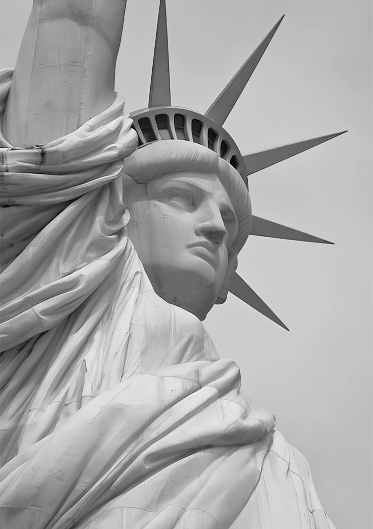 Een ingezoomd schilderij van het vrijheidsbeeld, in de kleuren zwart-wit.