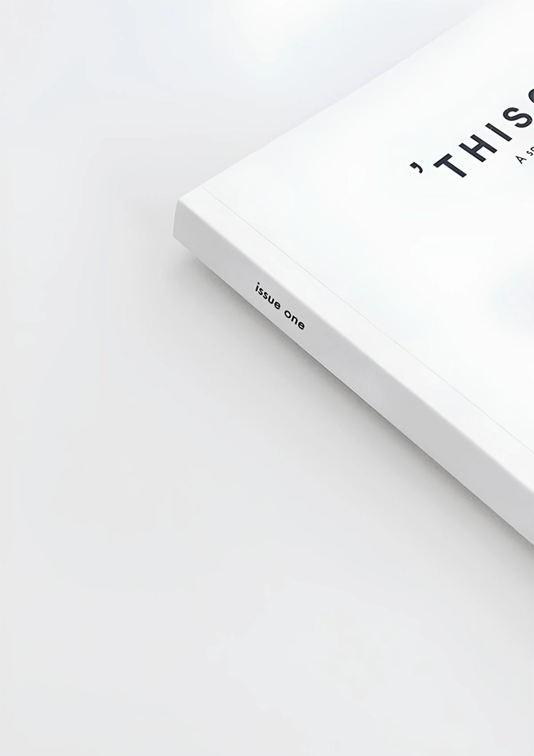 Een schilderij van een strak, wit tijdschrift met de titel "dit is" zichtbaar langs de rug. Op een lichtgrijze achtergrond.