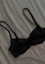 Een schilderij met in de hoofdrol een zwarte BH van kant, op een wit laken.