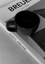 Een zwart-wit schilderij met een koffiemok die bovenop een boek met de titel "Marcel Breuer" staat.