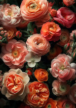 Dit schilderij toont een prachtige close-up van bloeiende bloemen in levendige tinten roze, perzik en oranje, met weelderige bloemblaadjes die het frame vullen. Het groen tussen de bloesems voegt een natuurlijk accent toe aan deze levendige compositie.
