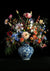 Dit schilderij toont een boeket met diverse bloemen, waaronder tulpen, pioenrozen en madeliefjes in een blauw-witte porseleinen vaas tegen een zwarte achtergrond.