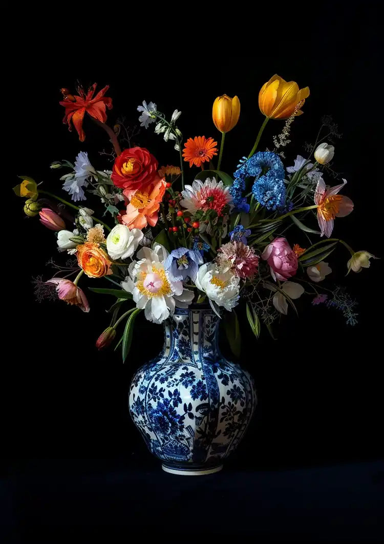 Dit schilderij toont een boeket met diverse bonte bloemen, waaronder tulpen, pioenrozen en madeliefjes in een blauw-witte porseleinen vaas tegen een zwarte achtergrond.