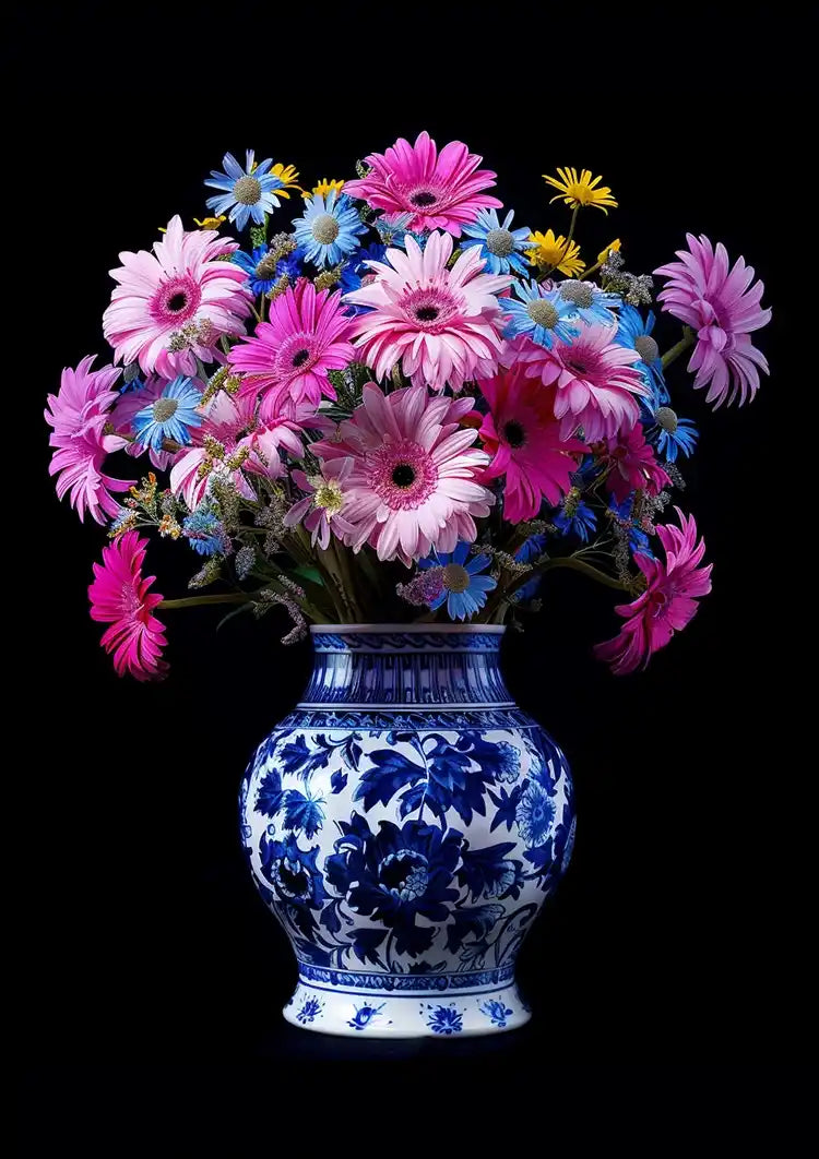 Schilderij van een blauw-witte keramische vaas vol met een groot, levendig boeket. Roze gerberamadeliefjes, blauwe en witte madeliefjes en andere bloemen stralen prachtig af tegen de zwarte achtergrond.
