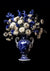 Dit schilderij toont een decoratieve porseleinen vaas met sierlijke handvatten en blauwe bloemmotieven bevat een arrangement van witte en blauwe bloemen. De achtergrond is zwart en benadrukt de ingewikkelde details en de levendige kleuren van de bloemen.