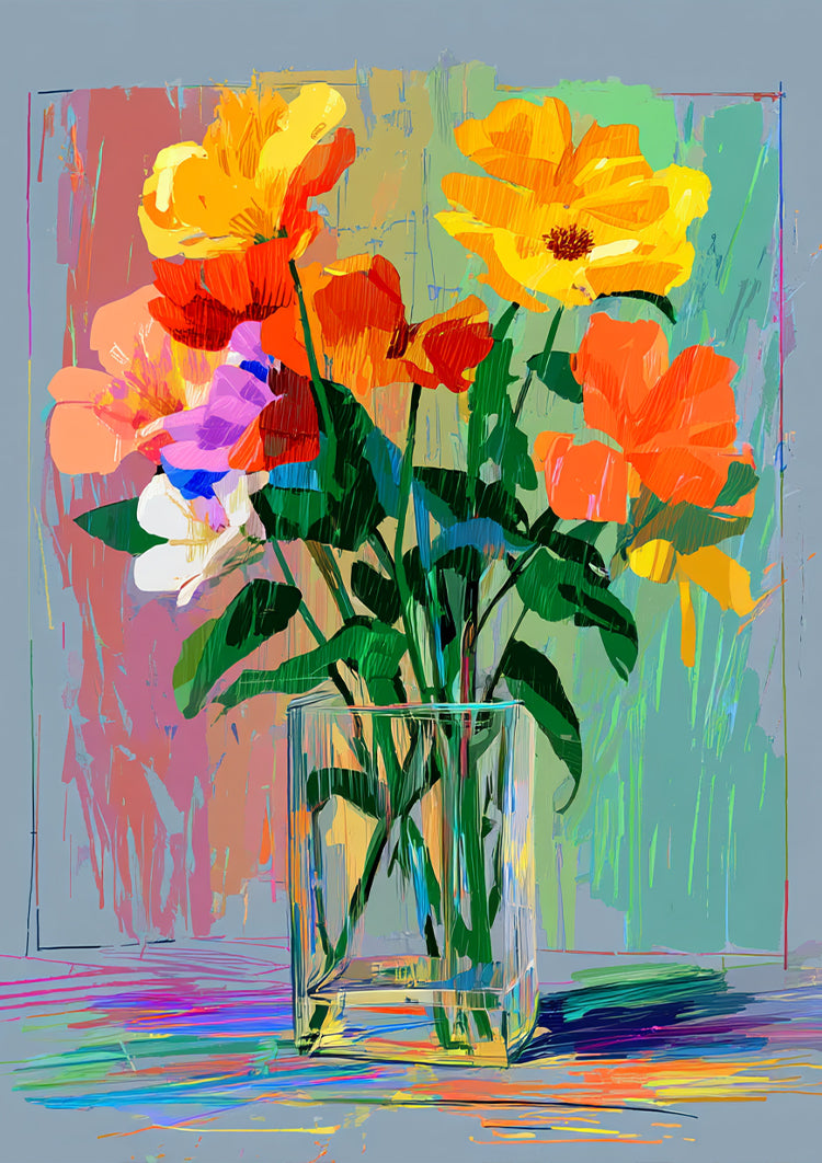Een modern bloemenstilleven in een glazen vaas, badend in een achtergrond van regenboogtinten.
