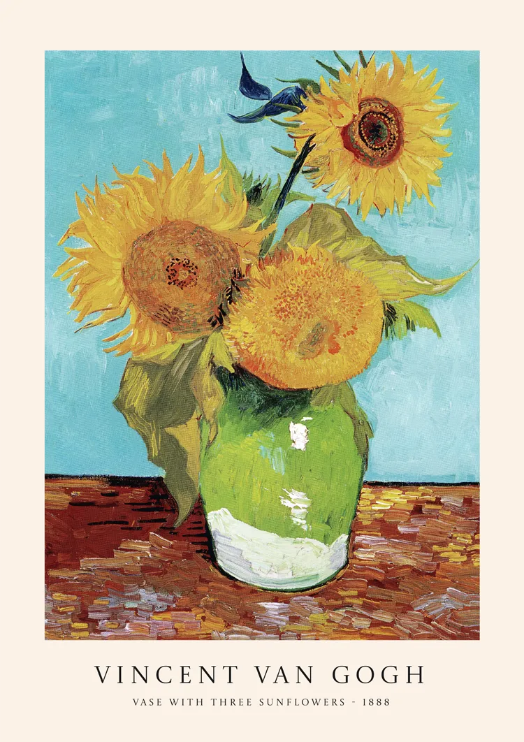 Dit schilderij toont drie zonnebloemen in een groene vaas op een houten ondergrond tegen een lichtblauwe achtergrond.