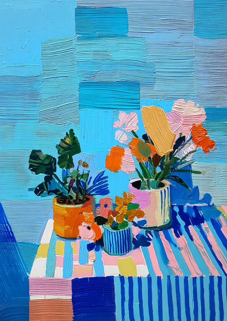 Een vrolijk schilderij met felgekleurde bloemen in vazen op een gestreept tafelkleed, omlijst door een achtergrond van frisse blauwtinten.