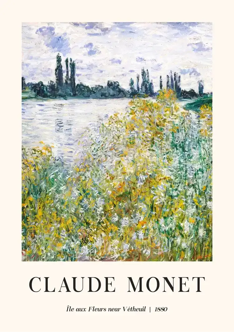 Dit schilderij "Île aux Fleurs nabij Vétheuil" uit 1880, toont een rivierlandschap met een blik op het centrum, omringd door struiken, wilde bloemen en hoge bomen langs de oever.