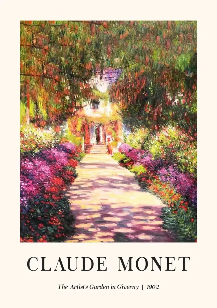 Dit levendige schilderij van Claude Monet, "The Artist's Garden in Giverny" uit 1902, vangt de pracht van een tuinpad omringd door kleurrijke bloemen en weelderig groen, leidend naar een schilderachtig huis.