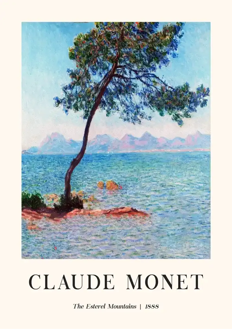 Dit schilderij, "The Esterel Mountains" uit 1888 van Claude Monet, toont een eenzame boom op een klein stuk land aan het water, met imposante bergen op de achtergrond.