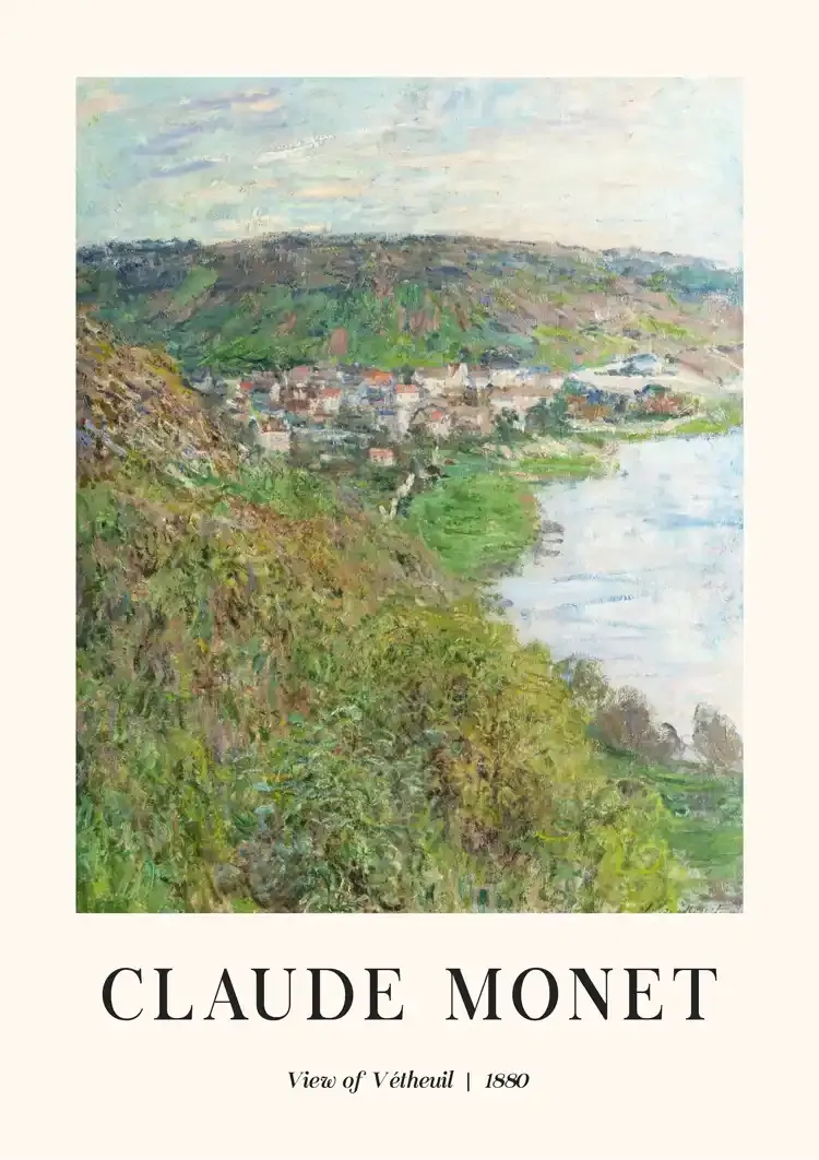 Dit schilderij, genaamd "View Of Vétheuil" door Claude Monet, toont een sfeervol landschap met een rivier, heuvels, groen en een dorp aan de waterkant, geschilderd in een impressionistische stijl die de essentie van het moment vastlegt.