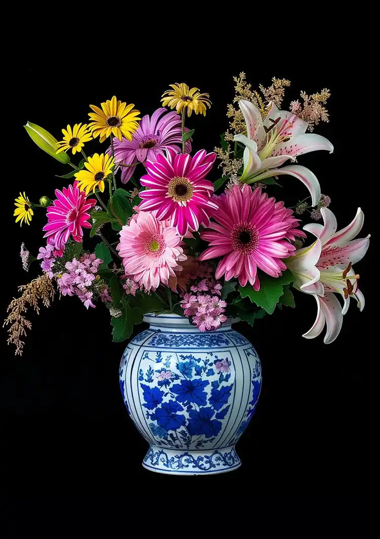 Schilderij van een blauw-witte porseleinen vaas met een kleurrijk bloemenarrangement. Roze gerbera's, gele madeliefjes, witte lelies en lichtroze bloemen schitteren tegen een zwarte achtergrond.