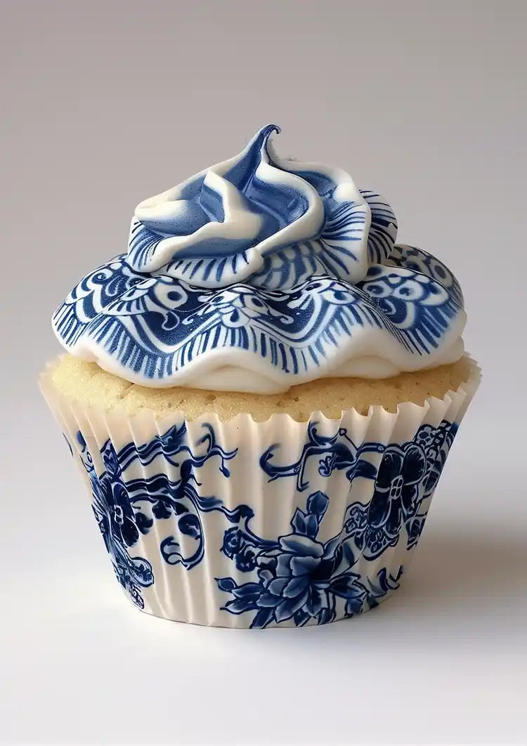 Schilderij van een cupcake met ingewikkeld blauw-wit glazuur. De bijpassende verpakking, versierd met gedetailleerde bloemen- en abstracte ontwerpen, maakt het geheel compleet.