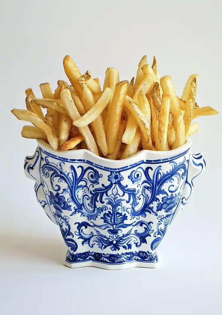 Dit schilderij toont een stapel frietjes geserveerd in een sierlijke blauw-witte keramische container met bloemmotieven en handvatten aan beide zijden tegen een neutrale achtergrond.