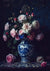 Dit schilderij toont een boeket met grote rozen met divers groen in een blauw-witte porseleinen vaas, zwak verlicht tegen een donkere achtergrond.
