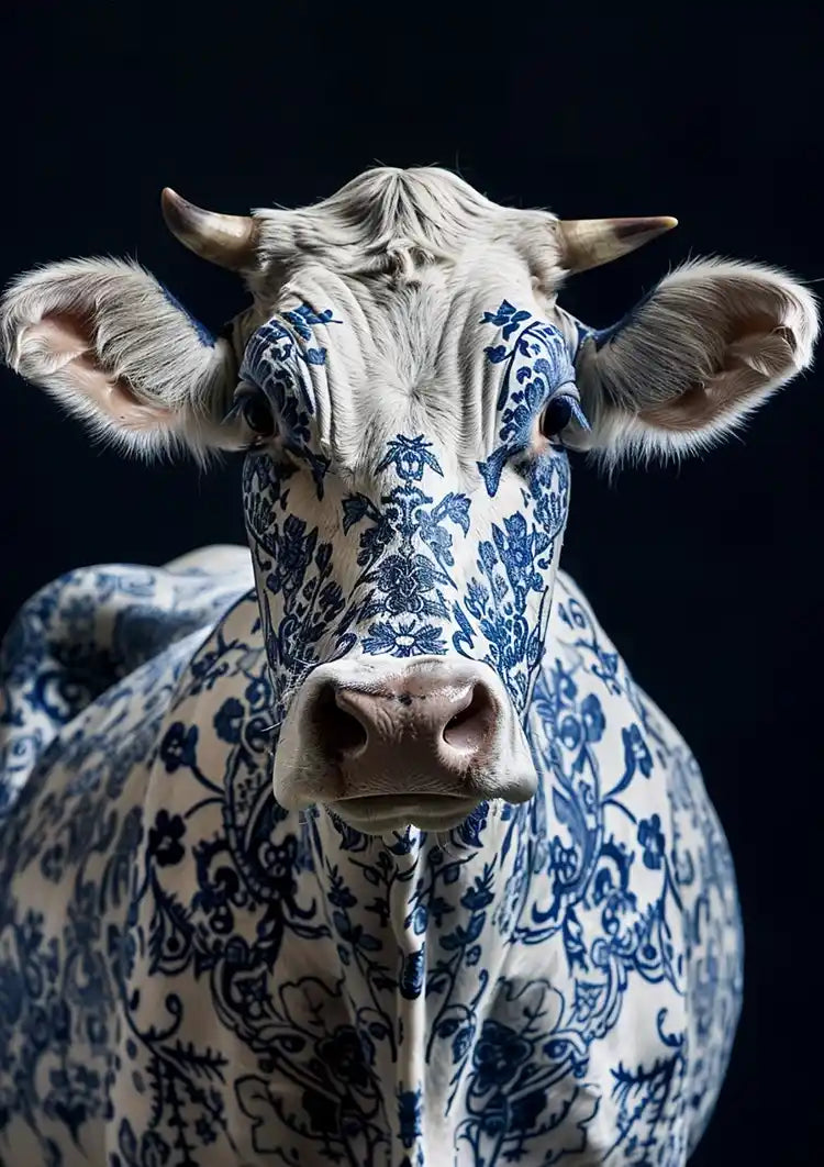Schilderij van een koe met ingewikkelde blauwe en witte bloemmotieven. Tegen een donkere achtergrond komt het gedetailleerde artwork prachtig naar voren.