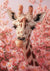 Op dit schilderij staat een giraffe te midden van roze en witte bloemen, waarbij zijn kop en lange nek boven de bloemen uitsteken. De achtergrond is zacht en gevuld met bloesems, waardoor een harmonieus natuurtafereel ontstaat, terwijl de giraffe centraal en gedetailleerd is vastgelegd.