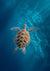 Een zeeschildpad zweeft sierlijk door helderblauw water, verlicht door zonnestralen van boven.
