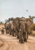 Dit schilderij toont een kudde olifanten, inclusief kalveren, lopend over een onverhard pad in een natuurlijke omgeving met een heldere lucht boven hen.