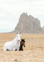 Dit schilderij toont een wit en een bruin paard in een droog landschap met een grote rotsformatie en een bewolkte lucht op de achtergrond.