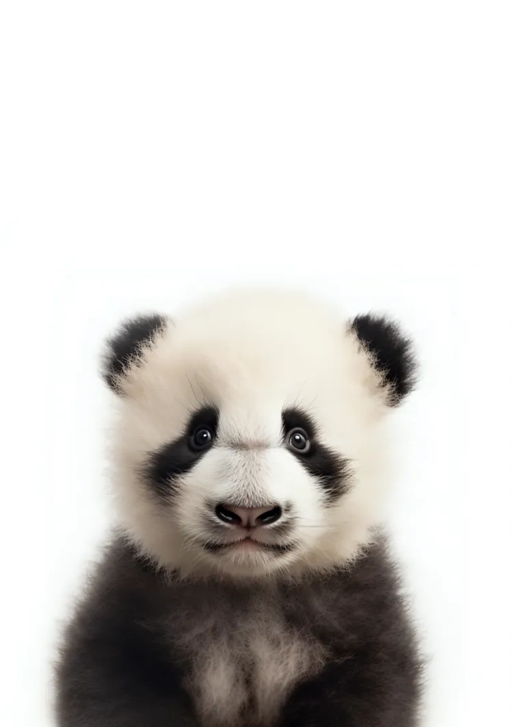 Dit schilderij biedt een close-up van een schattige pandawelp die recht in de camera kijkt, met ronde oren, een zwarte neus en donkere kringen rond de ogen. De witte en zwarte vacht voegt een zachte en levendige textuur toe.