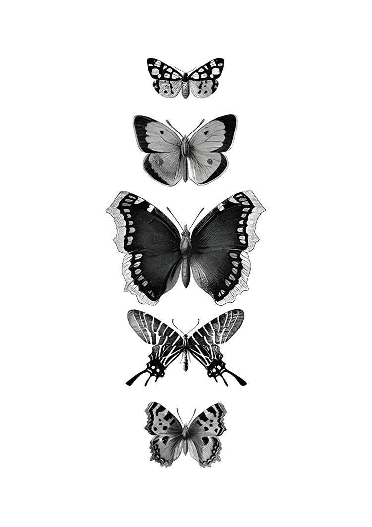 Verticale opstelling van vijf verschillende vlinders, boven elkaar weergegeven.