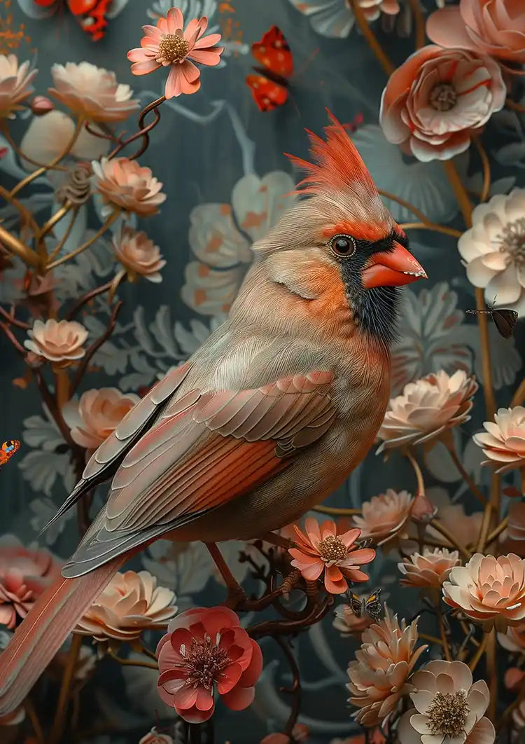 Op dit schilderij zie je een gedetailleerde illustratie van een vogel, te midden van bloeiende bloemen en ingewikkelde wijnstokken. Met felrood verenkleed, een opvallende kuif en omringd door vlinders, terwijl de achtergrond zachte bloempatronen in gedempte tinten bevat.