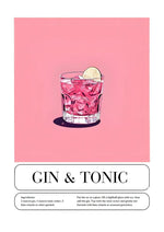 Dit schilderij toont een mooie illustratie van een gin-tonic met ijs en een schijfje limoen, op een roze achtergrond. Onder de afbeelding staat een recept met ingrediënten en bereidingsstappen.