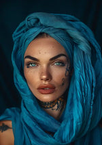 Dit schilderij toont een oriëntaalse vrouw met blauwe ogen en gezichtstatoeages, gehuld in een blauwe hoofddoek die haar haar bedekt. Haar intense blik en sproeten voegen karakter toe aan haar mysterieuze uitstraling.