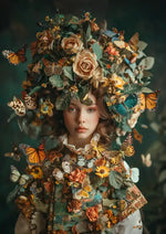Dit schilderij toont een dame met een neutrale uitdrukking, gekleed in een uitgebreide hoofdtooi en kledingstuk gemaakt van bloemen en vlinders. Het kleurrijke hoofddeksel met gele, roze en groene tinten wordt omringd door vlinders in diverse groottes en kleuren.