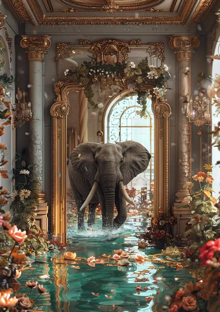 Dit schilderij toont een olifant in een rijkelijk versierde kamer met marmeren zuilen en een vloer gedeeltelijk ondergedompeld in water met drijvende bloemen en gouden details.