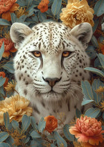 Dit schilderij toont een close-up van het gezicht van een luipaard, omringd door een bloemstuk van levendige oranje- en perzikbloemen, samen met groene bladeren. De intense blik van het luipaard is naar voren gericht, en zijn witte vacht is versierd met kenmerkende zwarte vlekken.