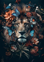 Dit schilderij vangt een levendig tafereel van een leeuw, omringd door kleurrijke bloemen, vlinders en vogels. De combinatie van dieren in het wild en flora creëert een harmonieuze en levendige compositie tegen een diepe, donkere achtergrond.