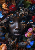 Dit schilderij vangt de blik van een persoon met opvallende blauwe ogen, omringd door levendige bloemen en gedetailleerde vogels, waardoor een betoverende samensmelting van mens en natuur ontstaat.