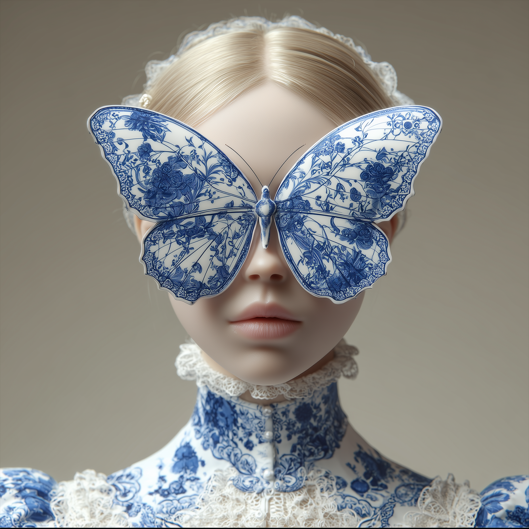 Portret van een vrouw met een vlindermasker van Delfts blauw porselein. Elegant, mysterieus en cultureel verfijnd.