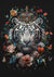 Dit schilderij toont een witte tijger met blauwe ogen en een kroon versierd met bloemen tegen een donkere achtergrond met verschillende bloemen en vlinders.