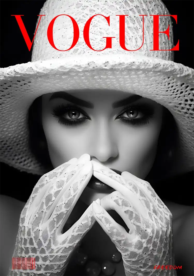 Schilderij van een modetijdschriftomslag getiteld "VOGUE" met een close-up van een vrouw met een witte hoed en kanten handschoenen.