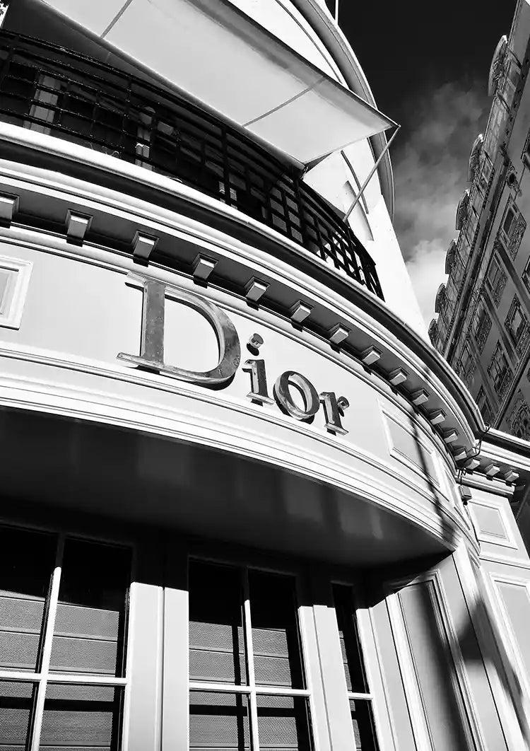 Dit schilderij toont een coole zwart-witfoto van een winkel met het stijlvolle Dior-logo. De winkel straalt een moderne en chique vibe uit met grote ramen en fancy details.