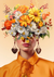 Dit prachtige schilderij toont een Orange Flower Lady met een groot boeket kleurrijke bloemen, perfect in harmonie met de mooie oranje achtergrond, waar haar schoonheid goed tot zijn recht komt.