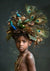 Dit schilderij toont een jongen met een diepe huidskleur, gekleed in een pauwenhoofdtooi, omgeven door de kleurenpracht van de pauw.