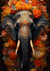Dit schilderij toont een versierde olifant omringd door levendige oranje, gele en blauwe bloemen met sierlijke symmetrische ontwerpen op zijn gezicht.