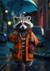 Dit schilderij toont een wasbeer rechtop in een regenachtige straat met een oranje regenjas en een gestreept shirt. De achtergrond toont een stadsstraat met vage bouwlichten, wat een grillige avondsfeer creëert.