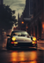 Dit schilderij toont een zwarte klassieke auto met koplampen aan, geparkeerd in de schemering op een natte stadsstraat. De weerspiegeling van de auto is zichtbaar op het glimmende trottoir, en gebouwen sieren de achtergrond, gedeeltelijk gehuld in mist en verlicht door straatlantaarns.