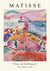 Een kleurrijk schilderij met de titel "Gezicht op Collioure 1905" van Henri Matisse. Het toont een kusttafereel met levendige, abstracte huizen, daken en een landschap in opvallende tinten rood, blauw, roze en groen.