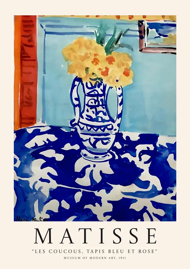 Dit schilderij van Matisse, 'Les Coucous, Tapijt in Blauw en Roze' uit 1911, vangt de essentie van levendige kleuren en speelse patronen in een tijdloze compositie.