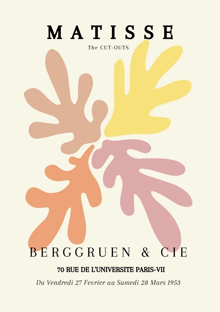 Dit schilderij heeft abstracte uitgesneden vormen in diverse kleuren op een effen achtergrond. Het kondigt de tentoonstelling "Matisse: The Cut-Outs" aan bij Berggruen & Cie in Parijs van 27 tot 28 februari 1953.