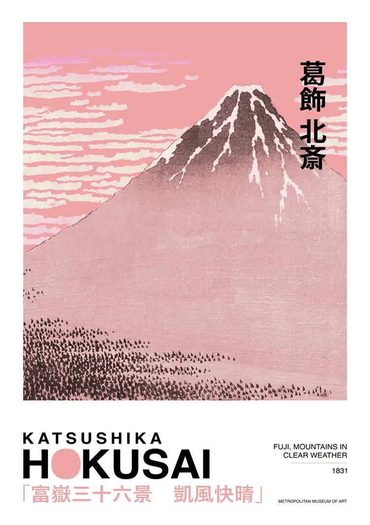 Dit schilderij "Fuji Bergen bij helder weer" uit 1831 toont de berg Fuji met een roze lucht en kanji-karakters aan de rechterkant.