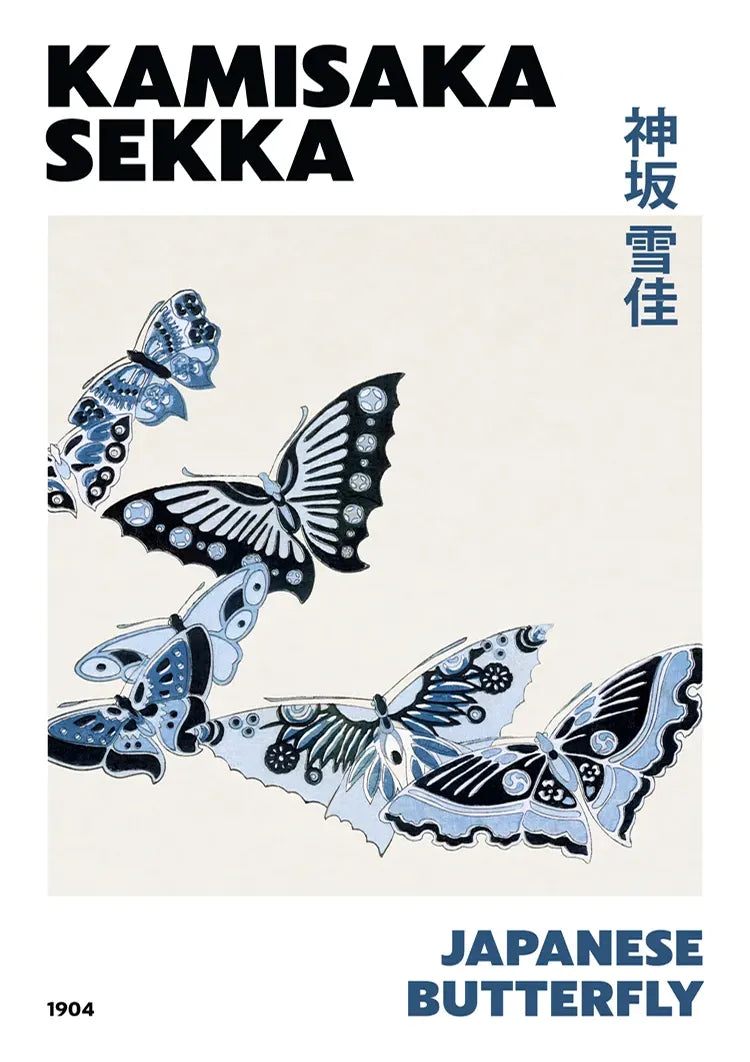Dit schilderij toont zes vlinders ontworpen in verschillende blauwtinten met ingewikkelde patronen tegen een effen achtergrond, met Engelse en Japanse tekst.