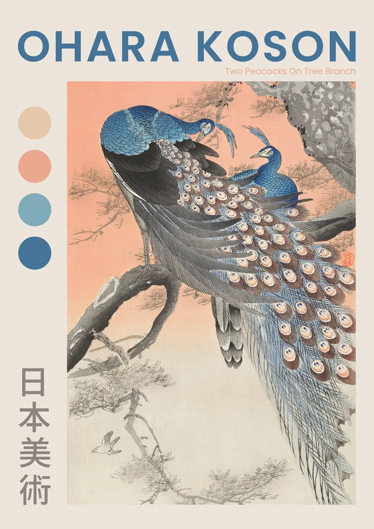 Dit schilderij toont twee pauwen op een boomtak tegen een achtergrond van zachte pastelkleuren. Japanse tekst en een kleurenpalet van blauw en beige zijn ook aanwezig.